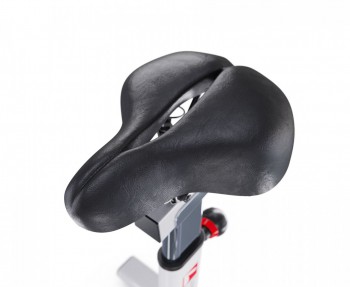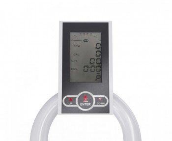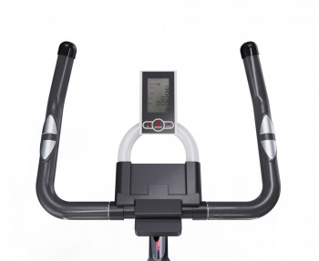 Спин-байк RAVS белого цвета имеет прочную стальную раму, что повышает его устойчивость и обеспечивает быструю езду. Он также оснащен большим алюминиевым маховиком с инерционным весом 19 кг, который обеспечивает дополнительный импульс и реалистичные ощущения от езды с препятствиями. Максимальный вес пользователя до 150 кг.